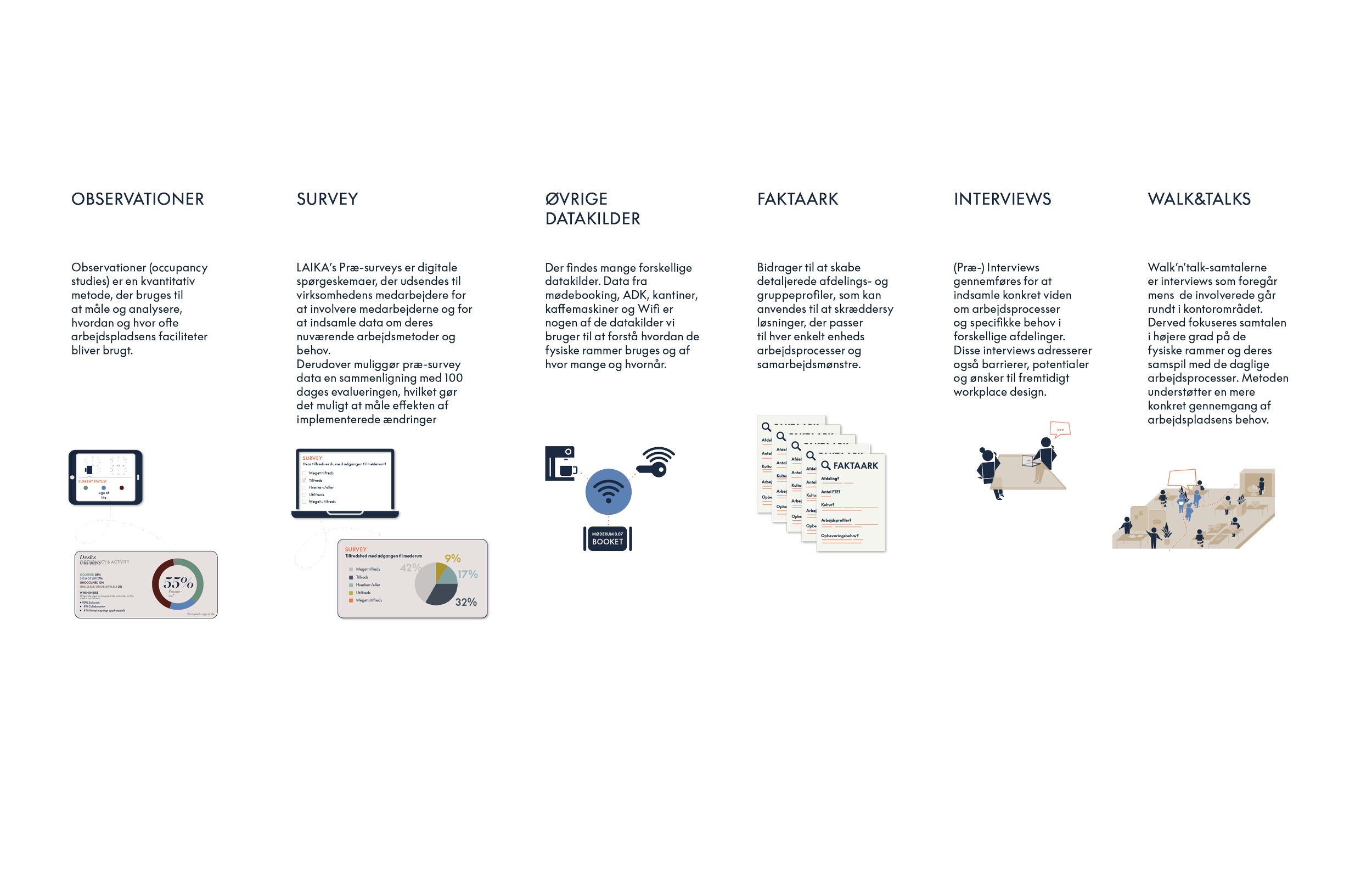 Dataindsamling er et værktøj i LAIKA’s proces og en vigtig brik i vores rådgivning - og ikke et produkt i sig selv. Selvom ‘data er vores ven’, som vi tit siger, og ofte leverer en stærk pointe, er data i sig selv ikke en fuld sandhed. Derfor kombinerer vi kvantitative og kvalitative teknikker for at understøtte LAIKA’s menneskecentrerede tilgang til arbejdspladsdesign.
