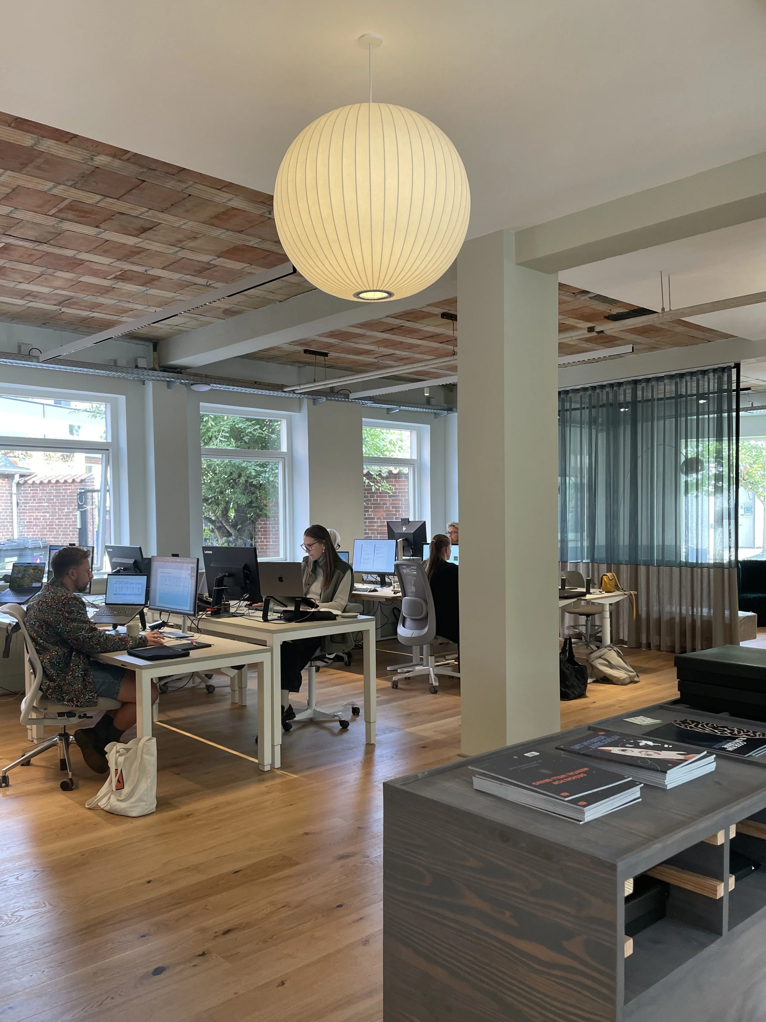 Vores design fremmer trivsel gennem dagslys, akustik, naturlige materialer og fleksible arbejdszoner, der understøtter både fællesskab og fordybelse.