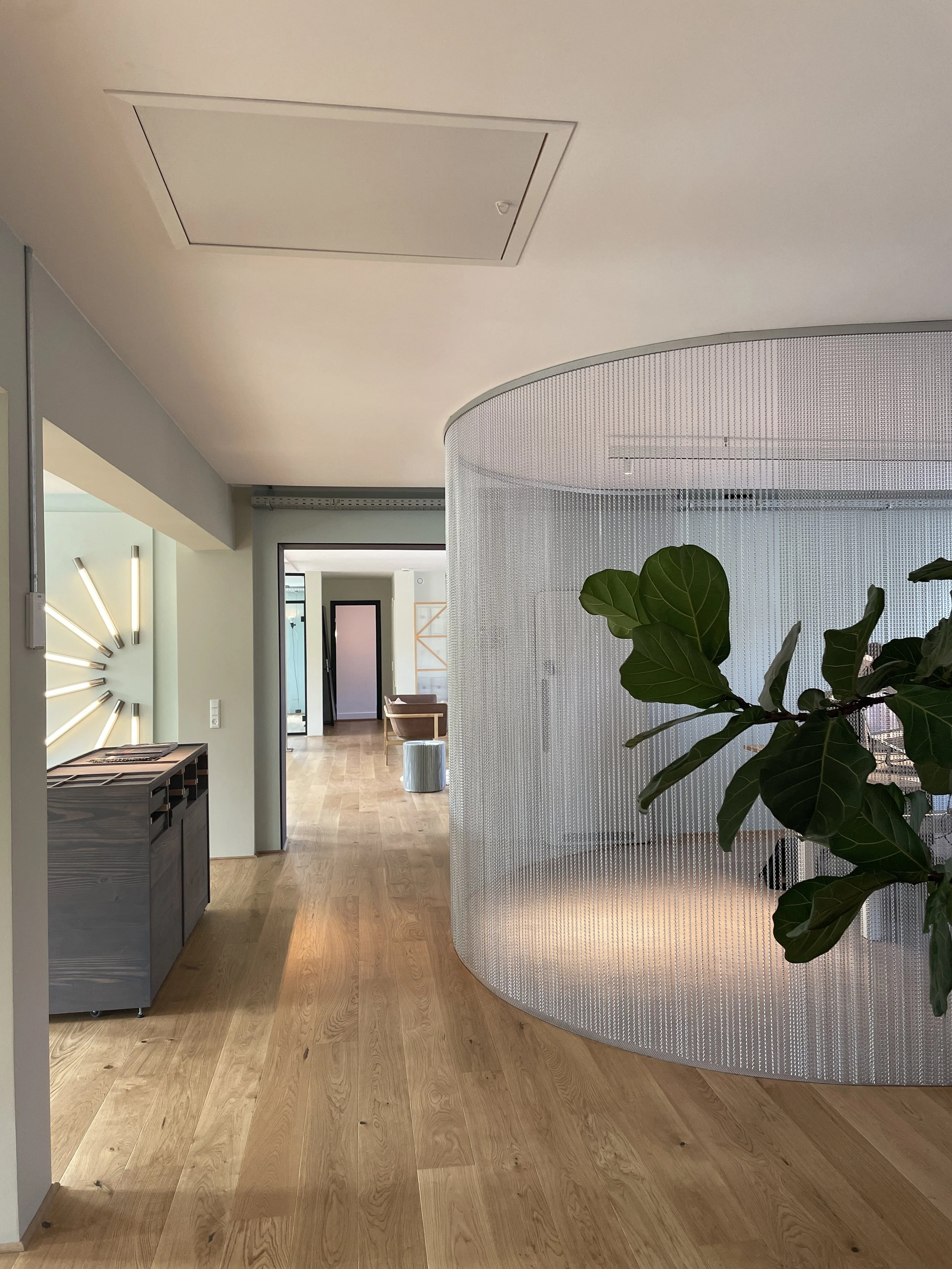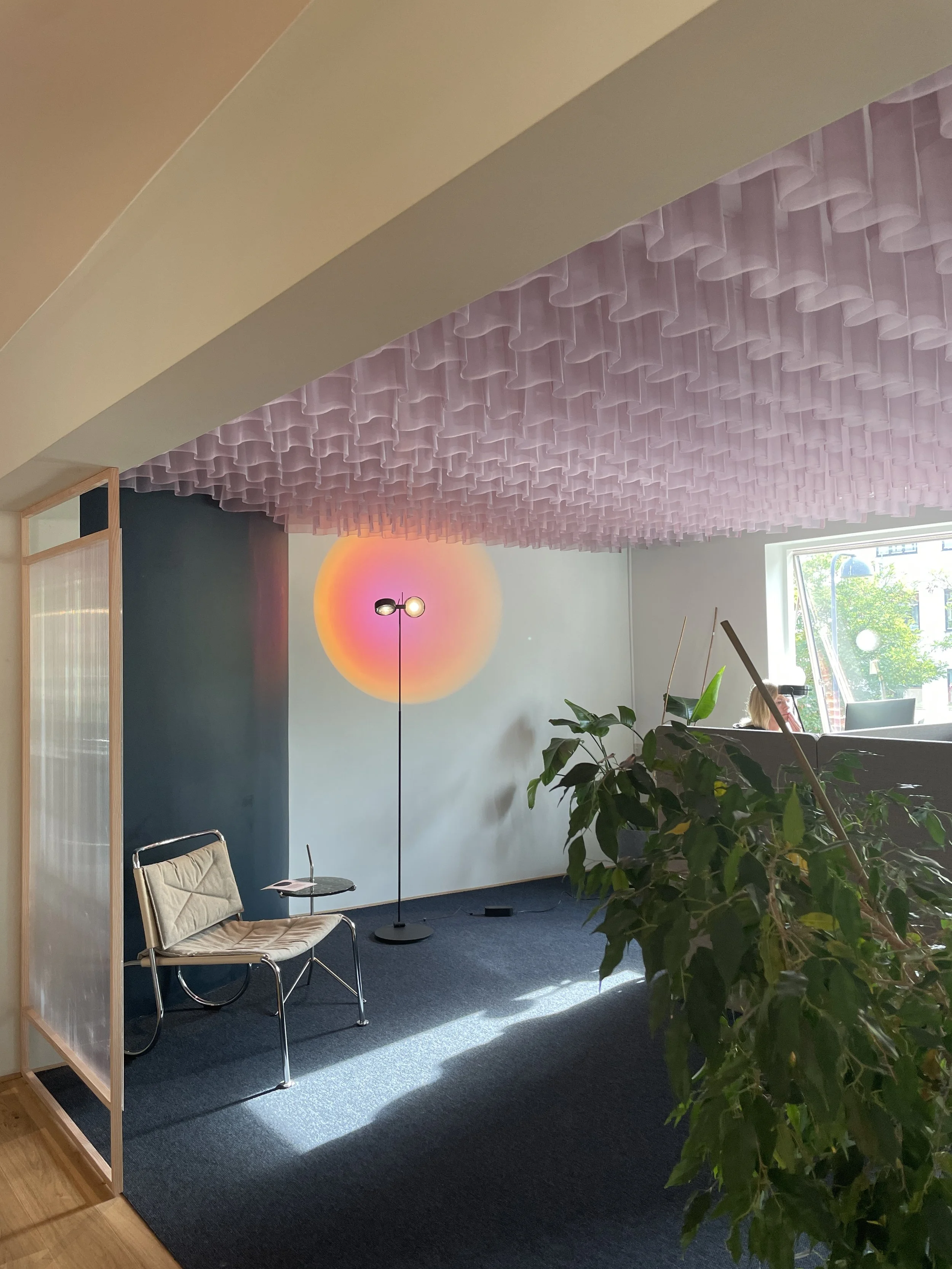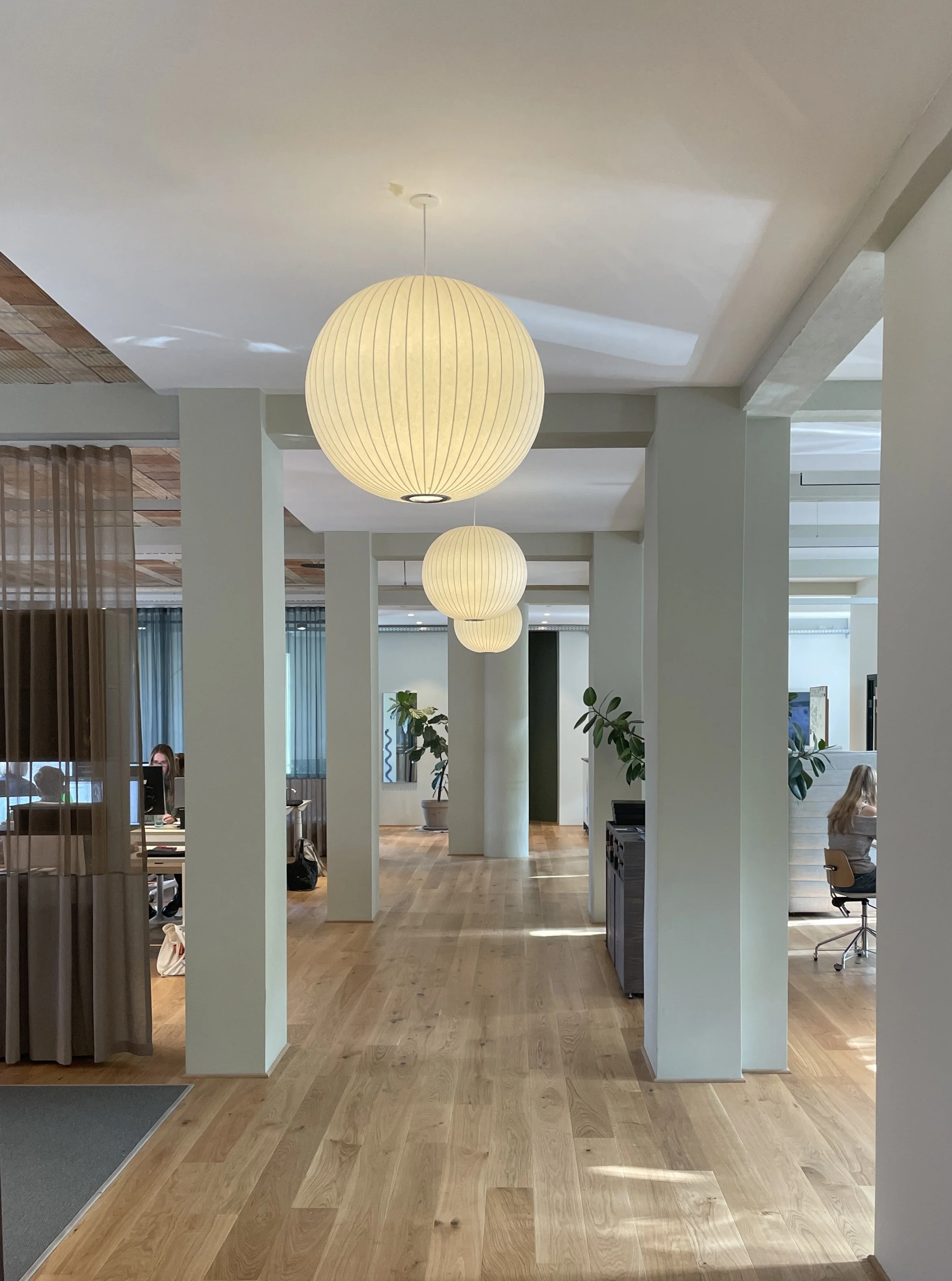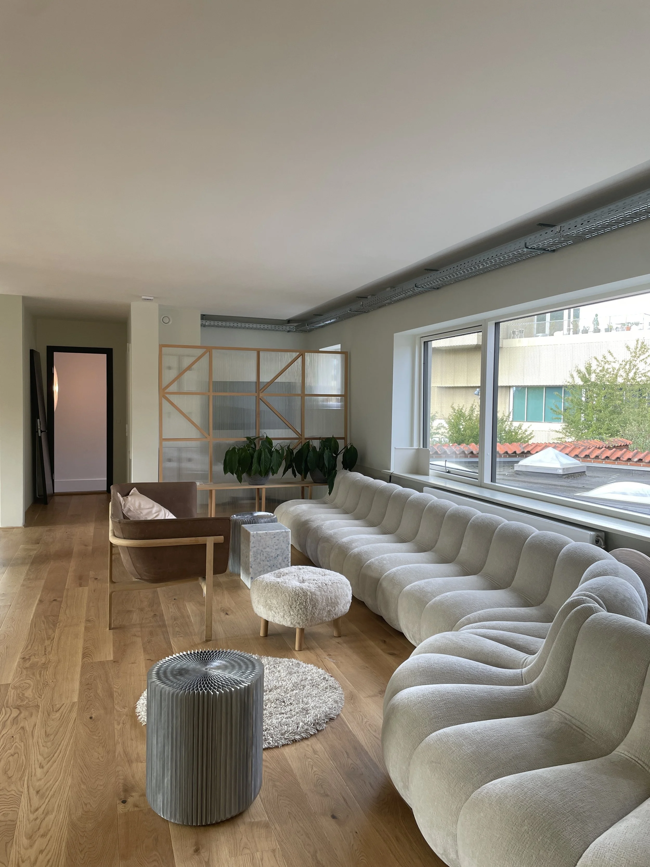 Kontoret er indrettet efter aktivitetsbaseret arbejde, hvor den enkelte medarbejder har frihed til at vælge den zone, der bedst understøtter deres arbejdsopgaver. Her er både områder til fordybelse, samarbejde, leg, bevægelse og frirum. Samtidig fungerer huset som et living space lab, hvor vi tester nye møbelløsninger og materialer i praksis.